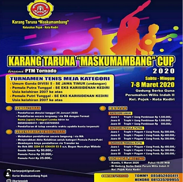 Halo warga Pojok dan sekitarnyaDi kesempatan kali ini, mimin mau ngasih info buat pecinta olahraga tenis meja nihJadi Karang Taruna “MASKUMAMBANG” Kelurahan Pojok mengadakan “MASKUMAMBANG” Cup yang akan digelar pada…